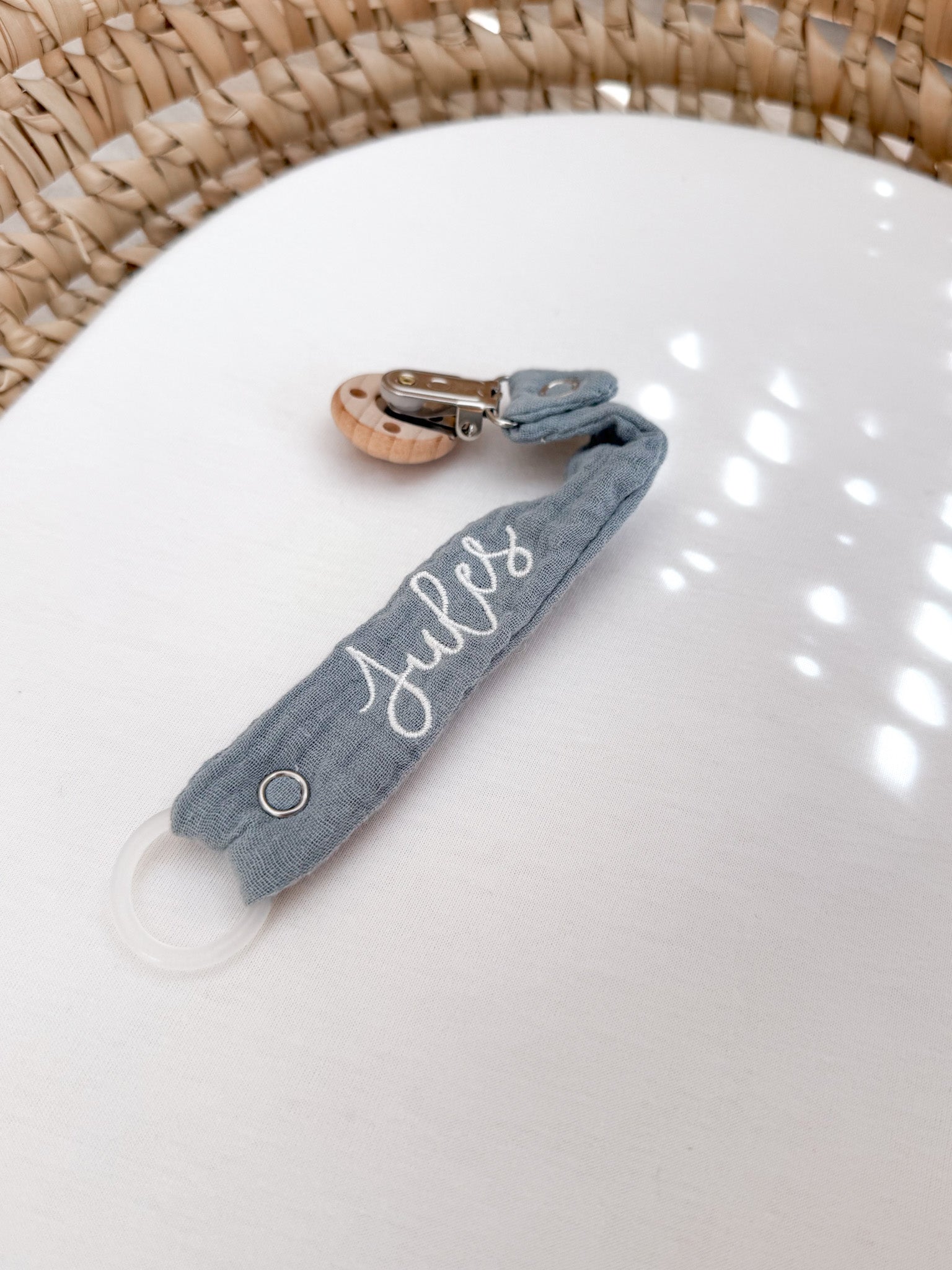 Envie d'un attache-tétine unique ? Personnalisez-le avec un prénom ou un mot tendre.